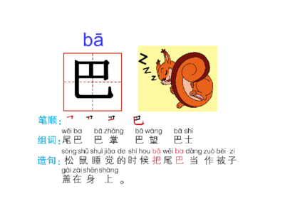 一年级比尾巴生字组词如下:比:比附、对比、评比。尾:尾巴、尾鳍、鸟尾。巴:泥巴、锅巴。短:短暂、短促、短途。把:把握、把舵。猴:猴子、猿猴、猴戏。松:松针、松脂、松香。