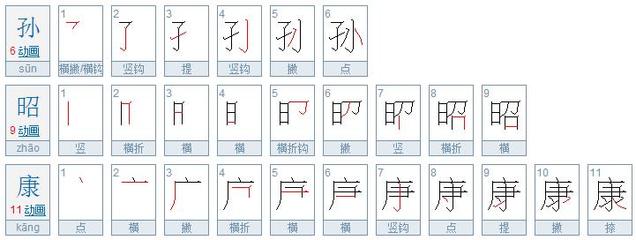 3、“昭”读音是:zhāo 含义:明显;显著:~彰。~著。表明;显示:以~信守。姓。组词:昭示、昭孝、昭星、昭德、泰昭 等。笔画:竖、横折、横、横、横折钩、撇、竖、横折、横。