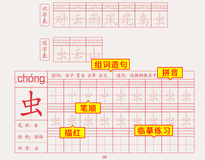 4、虫字的组词:飞虫、蚜虫、幼虫、瓢虫、虫子、虫牙、害虫、甲虫、昆虫、蝗虫、原虫、虫草、懒虫、蛔虫、长虫、疥虫、成虫、虫害、毛虫、大虫、腻虫、鱼虫、书虫。