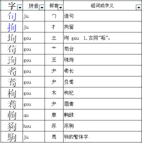 2、苗,描,瞄,喵,庙,媌;句,拘,驹;良,粮,娘,酿;者,猪,煮,著,诸,箸,渚,储;师,狮,浉;侯,猴堠,缑,糇,睺等。