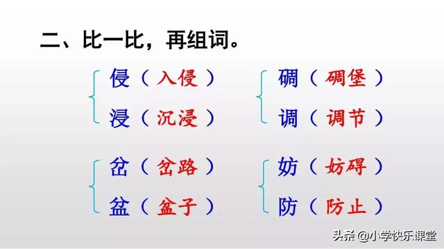 “侵”的组词为:入侵,侵害,侵蚀,侵虐,侵夺,侵占,侵权。“浸”的组词为:沉浸,浸没,浸润,浸湿,浸透,浸染,浸蚀。入侵[rù qīn](一国或一方)军队用武力强行进入(另一国或另一方)境内。