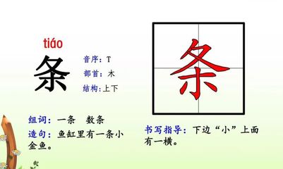 条组词有辐条、肋条、天条、粉条、条文、屏条、收条、条规、篾条、借条、律条、条款、条陈、条畅、油条、压条、通条、条几、词条、单条等。基本释义 [ tiáo ]植物的细长枝:枝条。