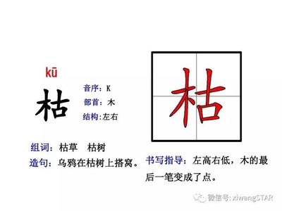 3、“枯”的组词:枯瘦、枯涸、枯燥、干枯、枯骨、枯寂、枯坐、偏枯、枯窘、枯涩、枯肠、枯朽、枯焦、枯身、枯壑、枯哑、枯陋、枯饼、枯耕、枯士。