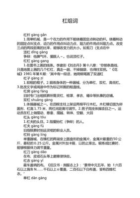2、杠的组词:高低杠、杠头、撬杠、双杠、单杠、杠杠、杠杆、杠夫、杠子、经济杠杆、顶杠、插杠子、石杠、棚杠等。杠:gāng ㄍㄤˉ。本义:床前横木。衍义:引申指“旗杆”。杠:gàng ㄍㄤˋ。