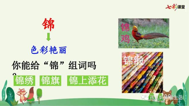 3、举例:文锦、荼锦、白锦、换锦、衣锦、夺锦、粗锦、翠锦、古锦、诗锦等。