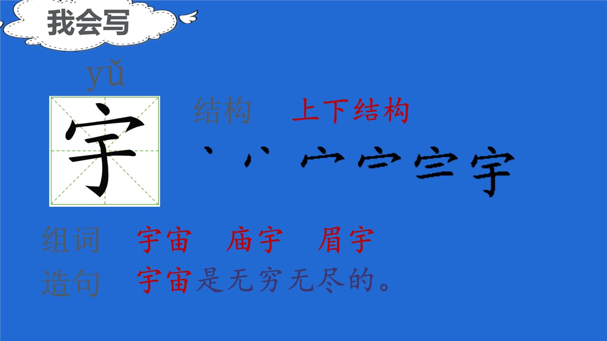 3、“宇”组词:天宇。屋宇。宇庭。宇室。寰宇。宇寰。宇甸。庙宇。故宇。宇县。古宇。宇内。玉宇。宇航。眉宇。气宇。宇堂。宇达。宇溜。宇守。宇称 。宇航员。宇宙观。器宇轩昂。宇称守恒。 宇宙飞船。玉宇琼楼。