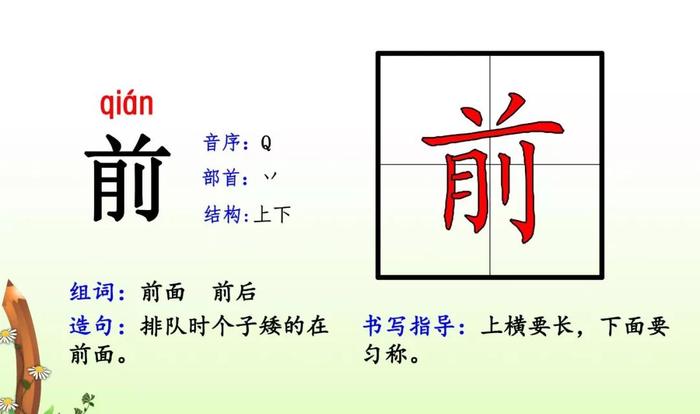 1、组词:前边、先前、以前、前进、提前、前天、从前、前方、空前、前奏 拼音:qián 部首:丷 方位词。在正面的(指空间,跟“后”相对):村前村后。 往前走:勇往直前。 方位词。