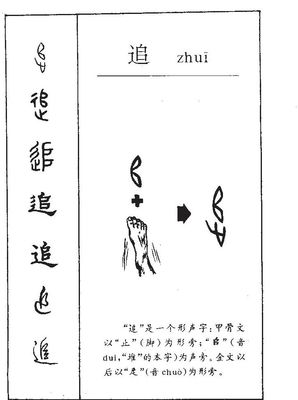 2、[ zhuī ]赶,紧跟着:追逐。追逼。追随。回溯过去,补做过去的事:追溯。竭力探求,寻求:追问。追寻。追究。追索。[ duī ]雕琢:追琢(雕刻)。古代乐器钟上用以悬挂的钮眼。