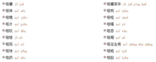 吱咀 [zī zuǐ]象声词。噍咀 [jiào zuǐ]咀嚼。咀脸 [zuǐ liǎn]脸面,脸色。指态度表情。咀呪 [zuǐ zhòu]诅咒;咒骂。