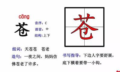 苍海、苍黄、苍凉、苍翠欲滴、苍狗、苍苍、白衣苍狗 另外,苍是汉语通用规范一级字(常用字) ,形声兼会意字,从并cǎo,仓声,声兼义 ,读作cāng。该字始见于始见篆文。