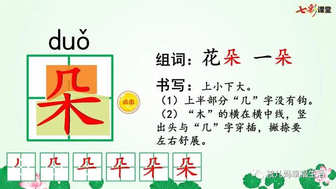 4、一朵花,一朵朵,一朵云,一朵儿。2花园里开着一朵朵的花。天空中飘着一朵云。海边有一朵朵浪花在拍打着海岸。