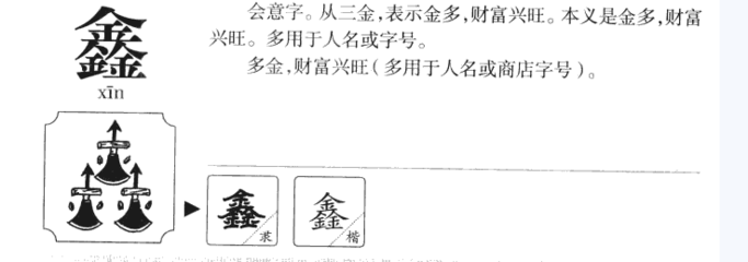 3、鑫 (xīn )商店字号及人名常用字,取金多兴盛的意思。