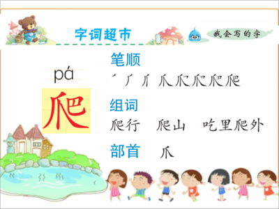 3、爬字可以组成:爬来爬去,爬上去,爬下来,爬坡,倒着爬,爬树,爬行,爬灰,爬虫,爬窝,爬拉,爬泳,爬行动物,东滚西爬。