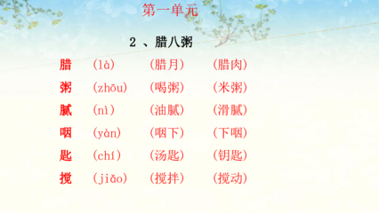 2、一粥一饭[yīzhōuyīfàn]意指衣食来之不易,主要是劝诫人们讲求节约。八宝粥[bābǎozhōu]混合许多菜料煮成的粥品。其中的菜料种类与数量,皆不一定。一般将剩菜与米合煮成稀饭,也称为“八宝粥”。