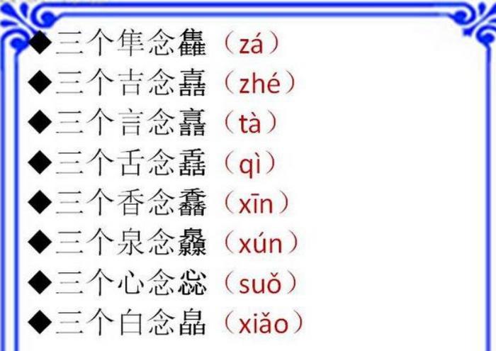 4、馫:读音为xīn,表示香气。 龘:读音为dá,形容龙腾飞的样子。 飝:读音为fēi,意味着快速飞翔,直上云霄。 鱻:读音为xiān,指新鲜的鱼类,应时的美食。 灥:读音为xún或quàn,形容众泉汇聚流淌。
