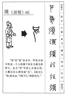 拼 音 xū 部 首 彡 笔 画 9 基本释义 必得,应当:无~。莫~有。必~。务~。~要。等待,停留:~留(迟留,留待)。男人面上生的毛,胡子:~眉(男子的代称)。