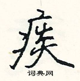 疾 jí 〈名〉会意。甲骨文字形,从大(人),从矢,字形象人腋下中箭。 段玉裁《说文解字注》:“矢能伤人,矢之去甚速,故从矢会意。”本义:受兵伤。泛指疾病。