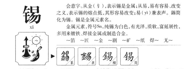 锡)xī ㄒㄧˉ 一种金属元素,银白色,质软,富延展性:焊~。~矿。~石。~纸。~箔。 赏赐:~命。~赉。 姓。