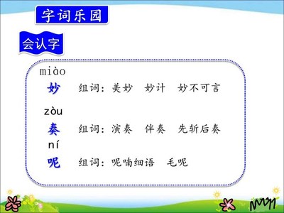 2、妙 miao 美,好:~语。~不可言。美~。~境。~处(chù)(a.好的地点;b.美妙的方面)。绝~。~趣横生。奇巧,神奇:巧~。~计。~用。奥~。~笔生花。灵丹~药。青春年少:~年。~龄。