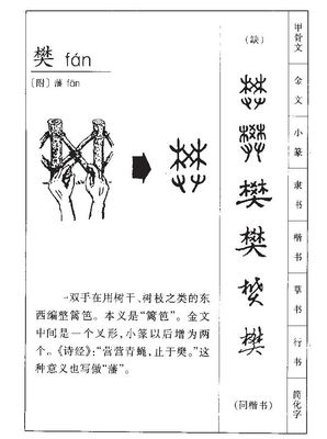 fán 部 首 木 笔 画 15 五 行 木 五 笔 SQQD 生词本 基本释义 详细释义 笼子:~笼(关鸟兽的笼子,喻不自由的境地)。篱笆:~篱(喻对事物的限制)。纷杂的样子:“~然淆乱”。