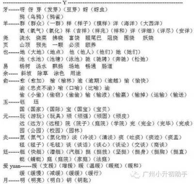 呀、讶、伢、蚜、芽、穿、蚜、迓、砑、牚、疨、谺、琊、枒、冴、笌、厊。
