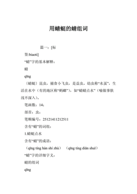 5、蜻组词:蜻虰、蛉蜻、蜻蛉、蜻蝏、蜻蛚、竖蜻蜓、蜻蜓树、捺蜻蜓、蜻蜓艇、蜻蜓舟、蜻蛚子、蜻蜓点水、蜻蜓撼石柱。晴,拼音 qīng 。形声。字从虫从青,青亦声。“青”意为“精华”、“最佳”。“虫”与“青”联合起来表示“虫类中的最好部分”、“好虫”。