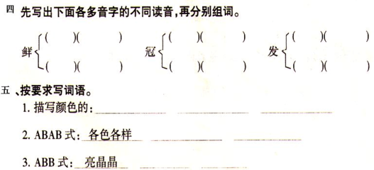 4、鲜 xiān 鲜花。鲜嫩。新鲜。鲜美。鲜甜。鲜明。鲜亮。鲜艳。海鲜。鲜 xiǎn 鲜为人知。屡见不鲜。