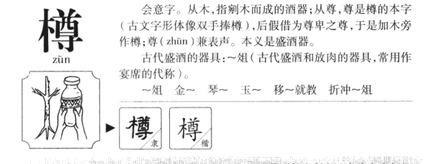 读音:zūn。名词:本作“尊”。本义:盛酒器。中国古代的盛酒器具。又如:樽杓(指饮酒之器)、樽桂(杯中的桂花酒)、樽酌(指饮酒之器)、樽酒(杯酒)。动词:往酒器里倒酒。少倾,摆出酒席,四位樽酒论文。