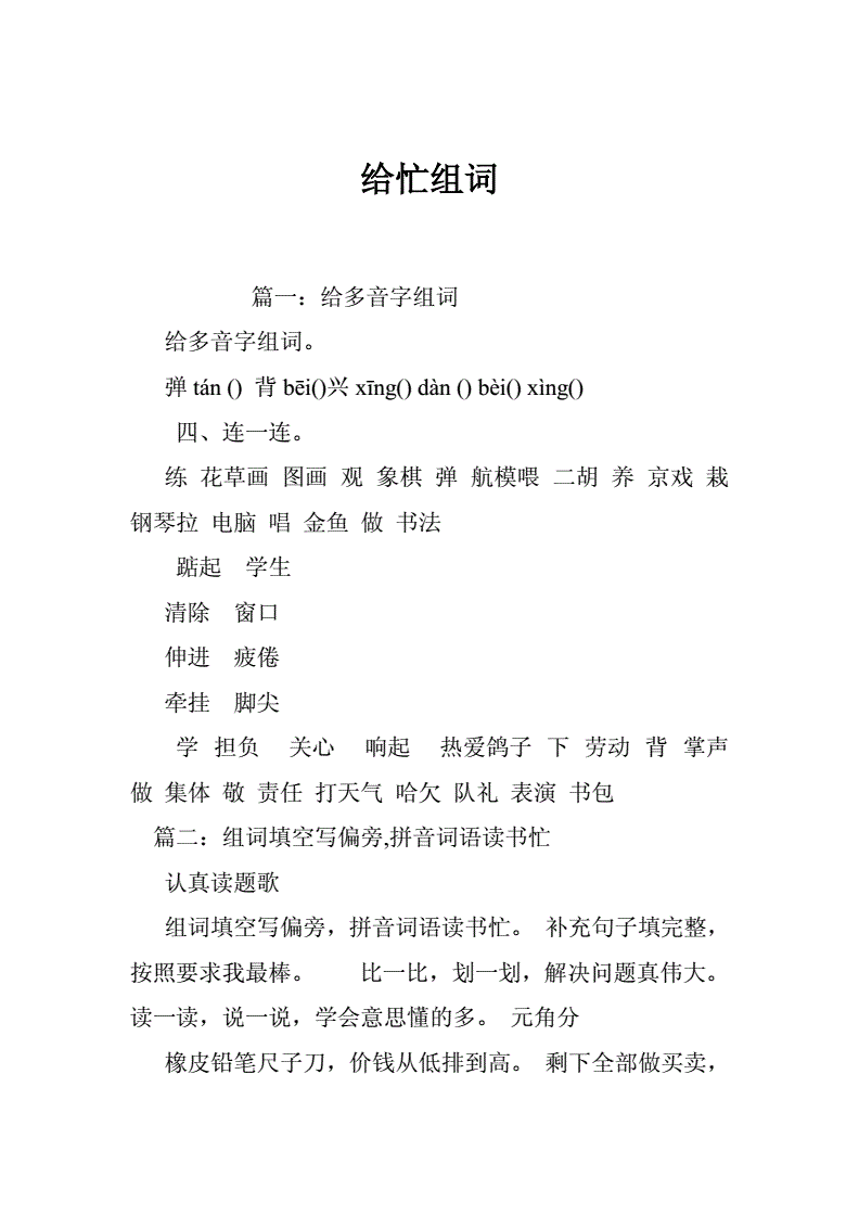 3、“忙”组词:匆忙。急忙。忙碌。忙乱。忙促。忙活。繁忙。忙于。忙迫。忙忙。忙工。帮忙。忙事。忙祥。忙然。忙郎 。赶忙。忙丢丢。忙劫劫。忙碌碌。忙不迭。忙忙碌碌。手忙脚乱。不慌不忙。急急忙忙。忙不择价。忙手忙脚。忙忙迭迭。忙上加忙。忙忙叨叨。 忙里偷闲。