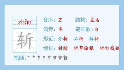 2、拼 音 zhǎn 部 首 斤 笔 画 8 基本释义 详细释义 砍断:~断。~首。~决。~除。~草除根。~钉截铁。先~后奏。披荆~棘。