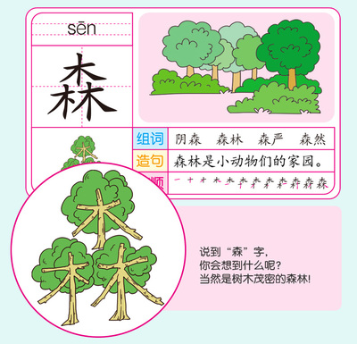 6、组词:森林、森立、森森、森然、森郁、阴森、森邃、森严 笔画数:12;部首:木;释义:树木众多,引申为众多、繁盛:森林、森立、森森、森然、森郁。幽深可怕的样子:阴森。森邃。严整的样子:森严。