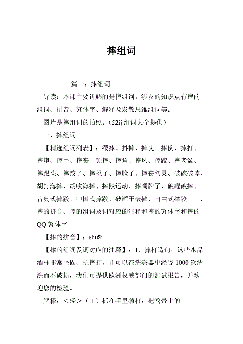 2、摔字在开头的词语:摔炮、摔手、摔老盆、摔伤、摔风、摔丧、摔交、摔倒、摔角、摔跤、摔破、摔脸子、摔筋斗、摔打、摔跟头、摔跤运动、摔跤子、摔阔牌子。摔字在中间的词语:古典式摔跤、中国式摔跤、哪里摔倒哪里爬、自由式摔跤。
