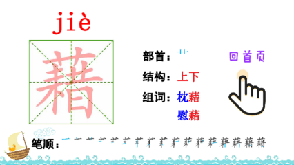 2、“藉”的音序是(J),用部首查字法。先查部首(艹)。jí、jiè两个读音。