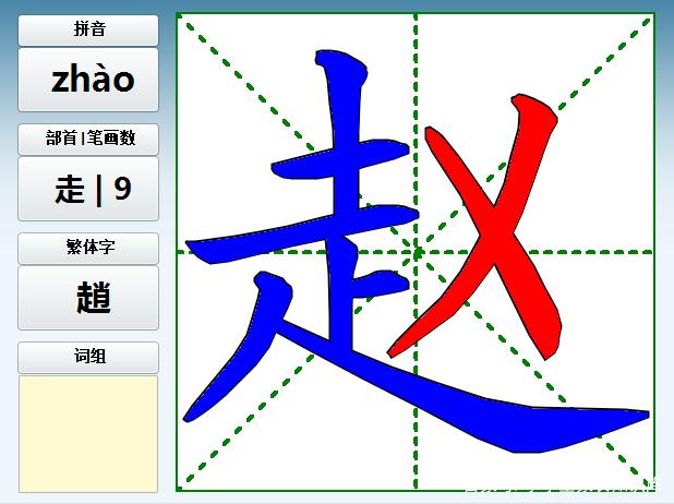 2、赵,读音:[zhào]释义:中国古代国名(a.战国时代的“赵”;b.西晋结束,匈奴族、羯族先后在北方建立“赵国”,史称“前赵”、“后赵”):~客(战国时燕赵多侠士,遂以“赵客”为侠士通称)。燕(yàn)~(燕赵之地,泛指北方)。姓。出处:赵将括。(赵国的将军赵括。