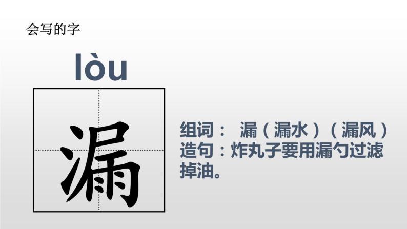 6、课《漏》生字组词是雨、漏斗、漏风、滴水不漏。物体由孔或缝透过:壶里的水~光了。~风。渗~。~泄(a.水、光等流出或透出;b.泄露)。电(跑电)。泄露:走~消息。~底(泄露内情)。透~。脱逃或无意放过:疏~。遗。挂一万。~网之鱼。
