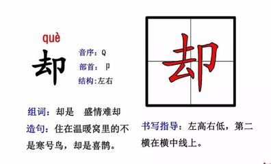 却组词二年级上册如下:忘却[wàng què](动)忘记。退却[tuì què]泛指畏难后退;退缩。推却[tuī què](动)拒绝;推辞。望而却步[wàng ér què bù]看到了可怕的或力不能及的事而往后退缩。了却[liǎo què](动)了结。省却[shěng què]减省、免除。