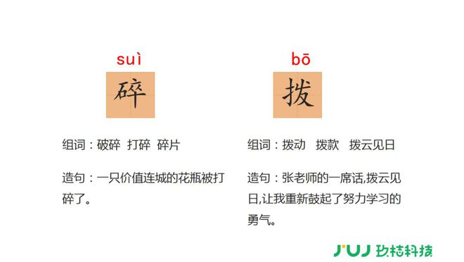 3、“拨”读音是:bō;“拔”的读音是:bá。拨 【读音】bō 【解释】(1)用手指或棍棒等推动或挑动。(2)分给。(3)治理。(4)掉转。(5)量词。拔 【读音】bá 【解释】(1)抽,拉出,连根拽出。(2)吸出。(3)选取。(4)超出,高出。(5)把东西放在凉水里使变凉。