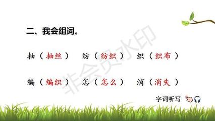 纺组词组词语如下:纺织娘:纺织女工。纺织:纺纱与织布。纺锤:手纺车中的一细长针靠它捻成线并绕在它上面。纺绩:把丝麻等纤维纺成纱或线。古代纺指纺丝,绩指缉麻。纺车:手握摇把带动轮子旋转的纺纱器具。纺丝:虫名。纺织娘的别名。纺砖:纺锤。