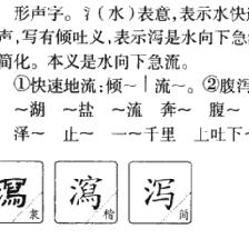 倾泻、泻肚、泻药、泻气、泻泪、泻注、泻盆、泻囊、泻邪、泻痢、泻证、泻火、上吐下泻 泻(xiè),中国汉字。意思是液体很快地流。又指把粉末状的物体一边放入液体一边搅拌,如熬粥时泻糁子。基本字义 液体很快地流。如:倾泻。排出稀屎。如:泻肚、泻药。