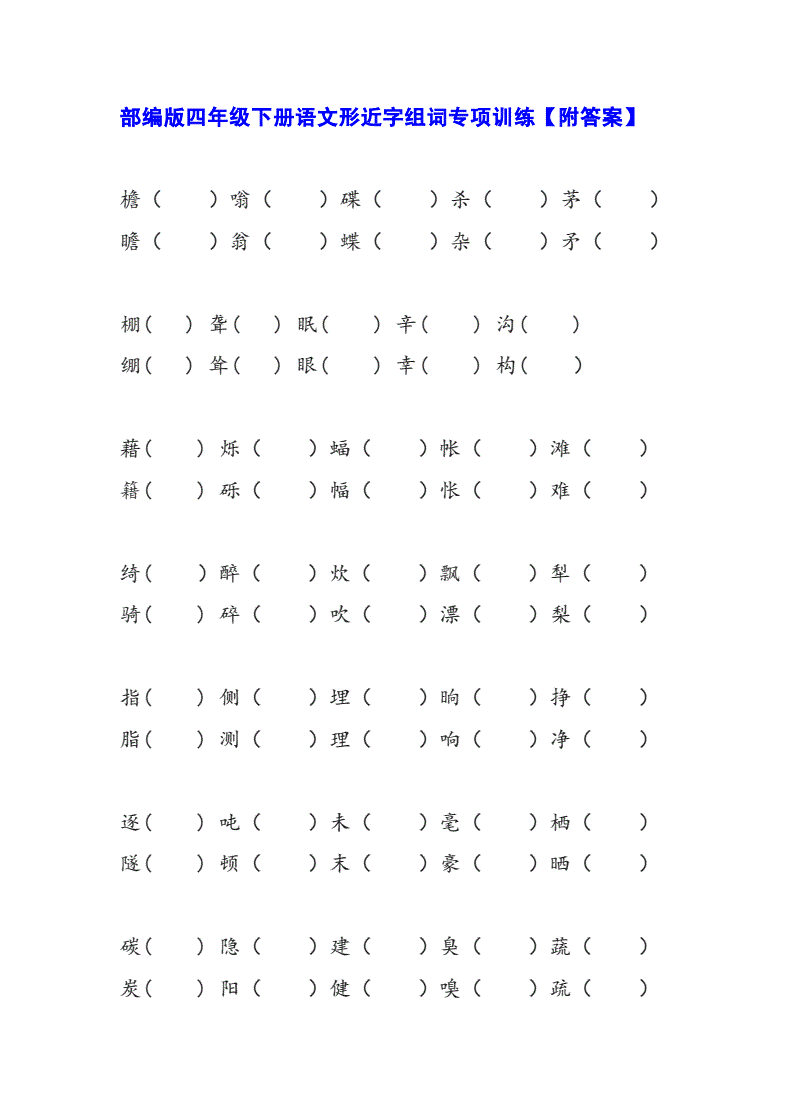 3、形近字组词:滕(滕州)腾(腾飞)。抑(抑郁)仰(仰首)。 躁(烦躁)燥(干燥)。拂(拂袖)佛(佛门)。嘶(嘶哑) 撕(撕毁)。揣(揣摩)湍(湍急)。煦(和煦)照(照样)。浪(波浪)酿(酒酿)。熟(不熟)熟(熟悉)。驮(驮马)驭(驾驭)。1涌(涌现)勇(勇敢)。
