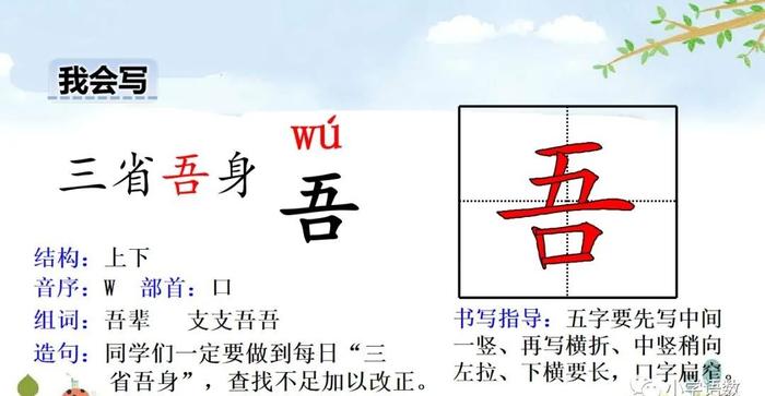 6、吾日三省[ wú rì sān xǐng ]多次反省自己的行为 吾命休矣[ wú mìng xiū yǐ ]吾:我;命-生命;休:停止;矣:语气助词。我要完了。我要死了。我不行了。吾许[ wú xǔ ]我处。吾祖[ wú zǔ ]我的祖先。 我的祖父。吾土[ wú tǔ ]我的乡土。