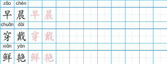 4、鲜艳[xiān yàn]释义:鲜明而美丽:~夺目。艳丽[yàn lì]释义:鲜明美丽:色彩~。~夺目。~的彩虹。艳羡[yàn xiàn]释义:十分羡慕。冶艳[yě yàn]释义:妖艳。艳福[yàn fú]释义:指男子得到美女欢心的福分。光艳[guāng yàn]释义:鲜明艳丽。