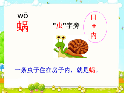 4、蜗牛的蜗组词:蜗牛、蜗居、耳蜗、蜗旋、篆蜗、蜗房、蜗蜒、龟蜗、蜗痕。蜗牛是指腹足纲的陆生所有种类。一般西方语言中不区分水生的螺类和陆生的蜗牛,汉语中蜗牛只指陆生种类,而广义的蜗牛还包括巨盾蛞蝓。蜗牛是一种包括许多不同科、属的动物。取食植物,产卵于土中或者树上。