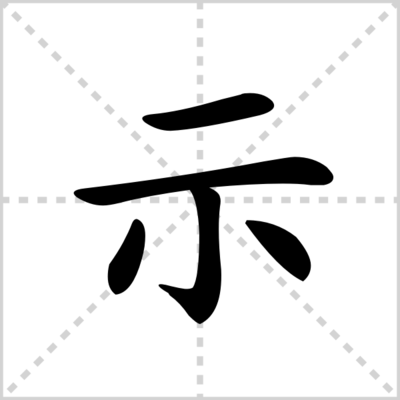 示组词:示意、表示、指示、预示、示范、展示、启示、暗示、示威、不甘示弱、炫示、示众、示意图、夸示、公示、标示、示例、示弱、明示、示警。解释:把事物摆出来或指出来使人知道;表示。出处:《周易·系辞下》:“夫乾确然,示人易矣;夫坤陨然,示人简矣。
