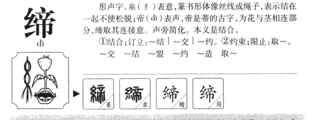 4、dì 声母d,韵母ì,声调四声。部首纟部,部外笔画9画,总笔画12画 五笔86XUPH,五笔98XYUH,仓颉VMYBB,郑码ZSWL 结合,订立:缔交。创立:缔构。禁止,约束:取缔。