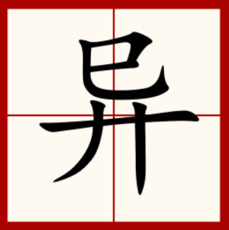 2、异[yì]差异。特异。诧异。异地。异常。异己(与自己意见不同或利害相冲突的人)。异端。异性。异样。大同小异。异曲同工。离异。异居。异日。异国。异乡。异类。奇异。异闻。怪异。
