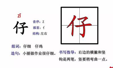 4、组词:仔细、仔鸡、仔猪、仔密、歌仔戏、仔兽、靓仔、仔畜、_仔、田仔、泡仔、牛仔服、烂仔、北屿仔岛、_仔、四仔、反骨仔、阿骚仔、勾仔、衰仔、猪仔国会、妹仔、叻仔、仔肩、扣仔、_仔、阿兴仔、鸟仔_、小仔、马仔、蛤仔、阿北仔、狗仔子、仔望、棍仔、夭寿仔。