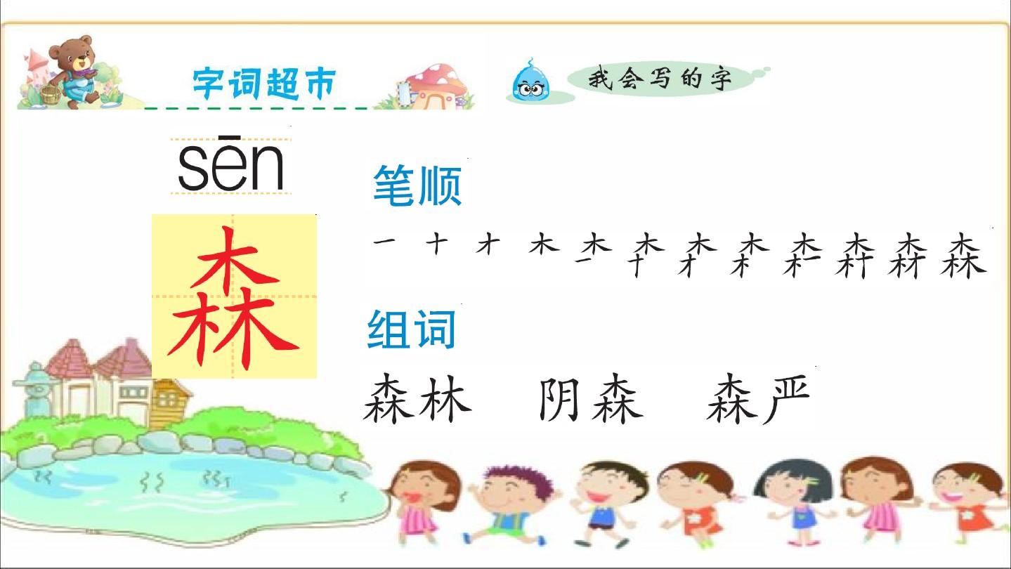 3、森林,森然,森立,森郁,阴森,森严 森林 造句:他们爱它,因为要到达那里你只能走过小溪上的桥;而周围的树木和背后森森的陡峭悬崖让它看起来就像森林空地上的屋子一样隔绝世事。