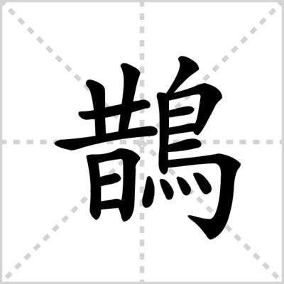 1、统一码:9E4A,笔顺:一,一,フ一一ノフ丶フ一 释义:指喜鹊鸟。民间传说听见它叫将有喜事来临。简称“鹊”,如“鹊报”(指喜鹊报喜),“鹊起”(喻兴起,崛起),“鹊桥”。