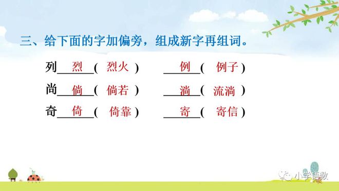 5、尚→倘,倘若;趟,趟过;躺,躺下;淌,流淌;徜,徜徉。仓→苍,苍天;沧,沧海;舱,船舱。帛→锦,锦绣;棉,棉花;绵,绵羊;。分→芬,芬芳;吩,吩咐;粉,粉红;份,身份。